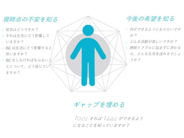 最後に、現時点の不安と今後の希望とのギャップを埋めます。そうすることで、患者さんは希望通りの生活を送るうえで ISC がいかに役立つかを理解できます。