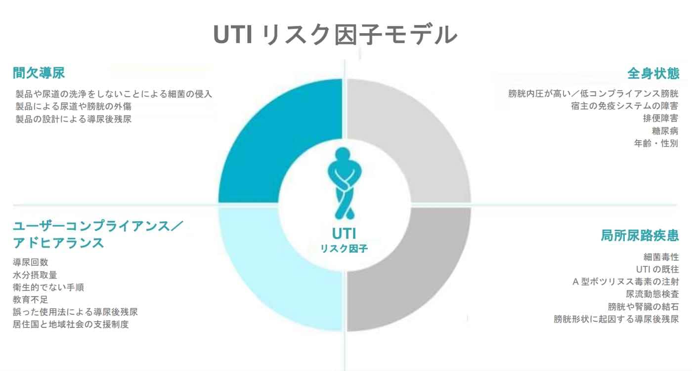 医療従事者は、これらの患者集団における UTI 発症を抑制すべく尽力しています。問題は、どうすれば抑制できるかです。UTI にかかりやすくなる要因があるのでしょうか?積極的に対処することで、UTI の発症を抑制できる特定の行動パターンや因果関係があるのでしょうか?これらの問題を解明しようと、泌尿器科医、神経科医、リハビリテーション医学分野の医師から成る国際的グループが協力して、UTI リスク因子モデルを開発しました 4。