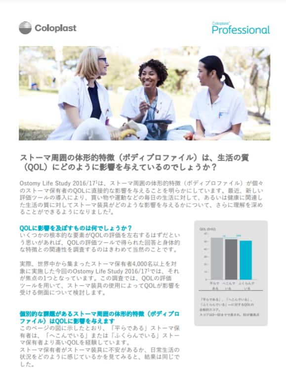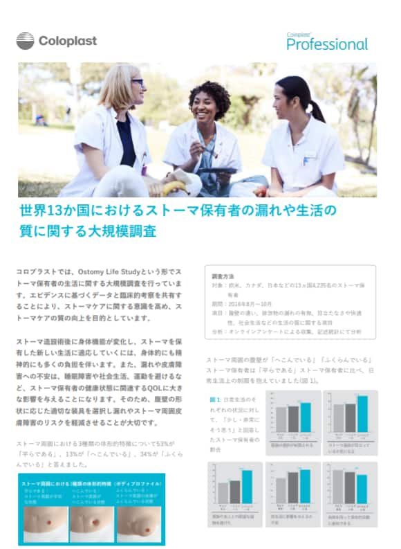 ストーマ周囲の形状は人によって異なります。ストーマ周囲の体形的特徴を評価するため、ボディプロファイル・ターミノロジーは648種類の異なる体形を考慮し、「平らである」、「へこんでいる」、「ふくらんでいる」の 3つのカテゴリーに分類しています。このボディプロファイル・ターミノロジーとアセスメントに対して、2018年、27カ国2000名以上の看護師がストーマケアの臨床実践ガイドラインについて国際的な合意をしました。