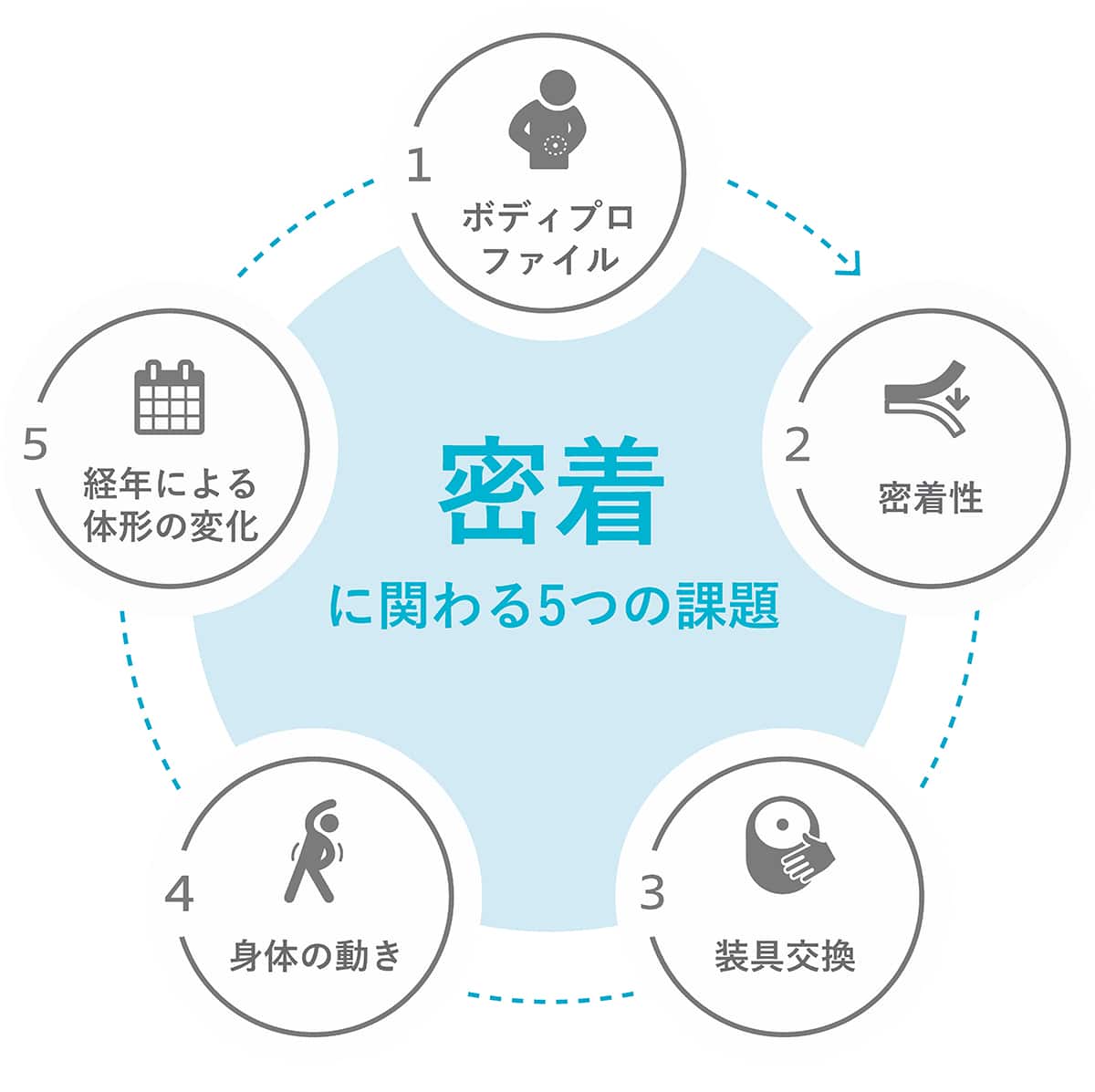 正しい密着感は、患者さんに安心感を与える第一歩であり、漏れを防ぐために最も重要です。正しい密着は、漏れや皮膚障害を繰り返さない鍵となります。正しく装具を密着させることは、簡単なことではありません。コロプラストでは、密着性を確保するために5つの課題があると考えています。